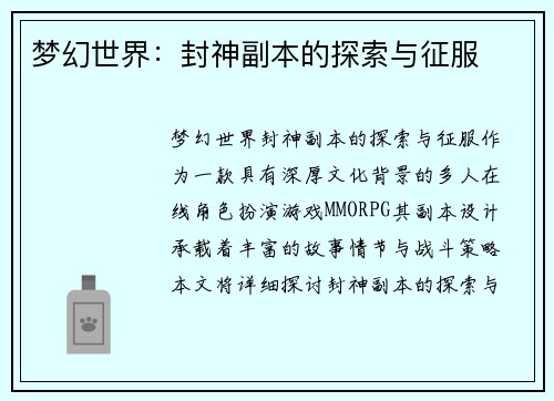 《梦幻世界:封神副本的探索与征服》作为一款具有深厚文化背景的多人在线角色扮演游戏(MMORPG),其副本设计承载着丰富的故事情节与战斗策略。本文将详细探讨“封神副本”的探索与征服过程,旨在帮助玩家深入理解这一副本的挑战与魅力。首先,我们将简要介绍该副本的背景与特点,接着从副本的设计理念、玩家的策略挑...